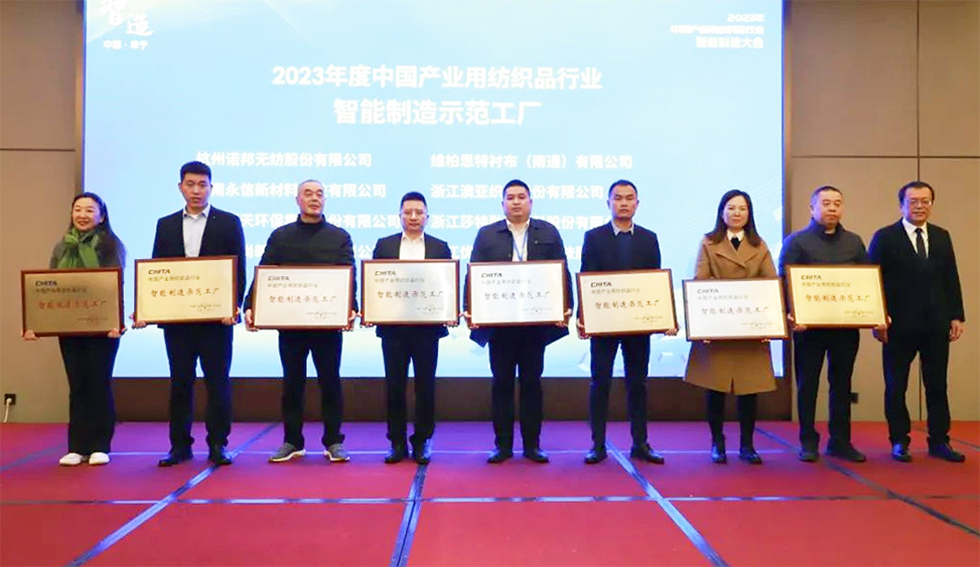 年初,中国产业用纺织品行业协会在行业内开展了智能制造试点示范项目征集。11月17日,2023年中国产业用纺织品行业智能制造大会在江苏阜宁召开,会上发布了2023年度中国产业用纺织品行业智能制造示范工厂、优秀场景和解决方案优秀供应商获奖名单,与会领导为获奖企业进行了授牌。诺邦股份作为“2023年度中国产业用纺织品行业智能制造示范工厂”获奖企业受邀参加本次大会,并在会上分享了企业智能工厂建设经验。